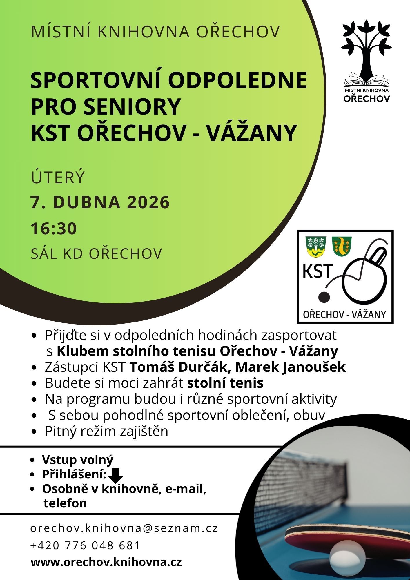 Místní knihovna pořádá pro seniory sportovní odpoledne, které se uskuteční v úterý 7. 4. 2026 v 16.30 hod. v sále kulturního domu. Přijďte si v odpoledních hodinách zasportovat s Klubem stolního tenisu.